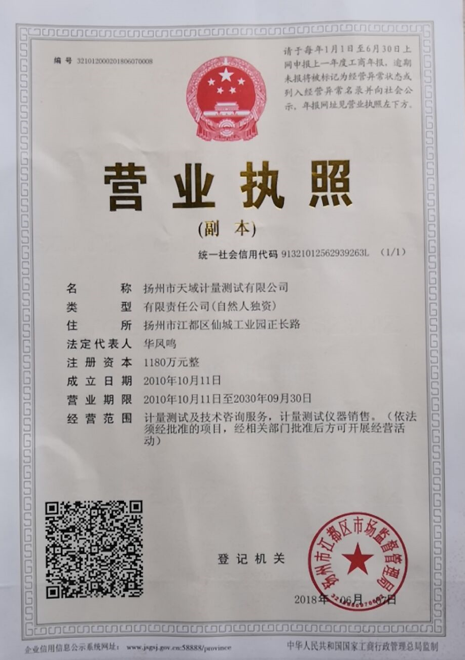揚州市天域計量測試有限公司,是于2010年10月成立的一家集計量器具檢測,計量技術咨詢和計量器具銷售為一體的專業化技術機構的專業機構。
